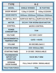 Thông số kỹ thuật cửa tự động KTH K-2
